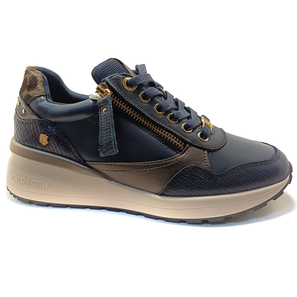 Zapatilla de mujer, de la marca Carmela. Fabricada en piel de alta calidad. Cierre mediante cremallera lateral y cordones ajustables. Detalle de piezas con efecto metalizado y tachuelas pequeñas. Suela de goma antideslizante. Con plantilla extraíble.