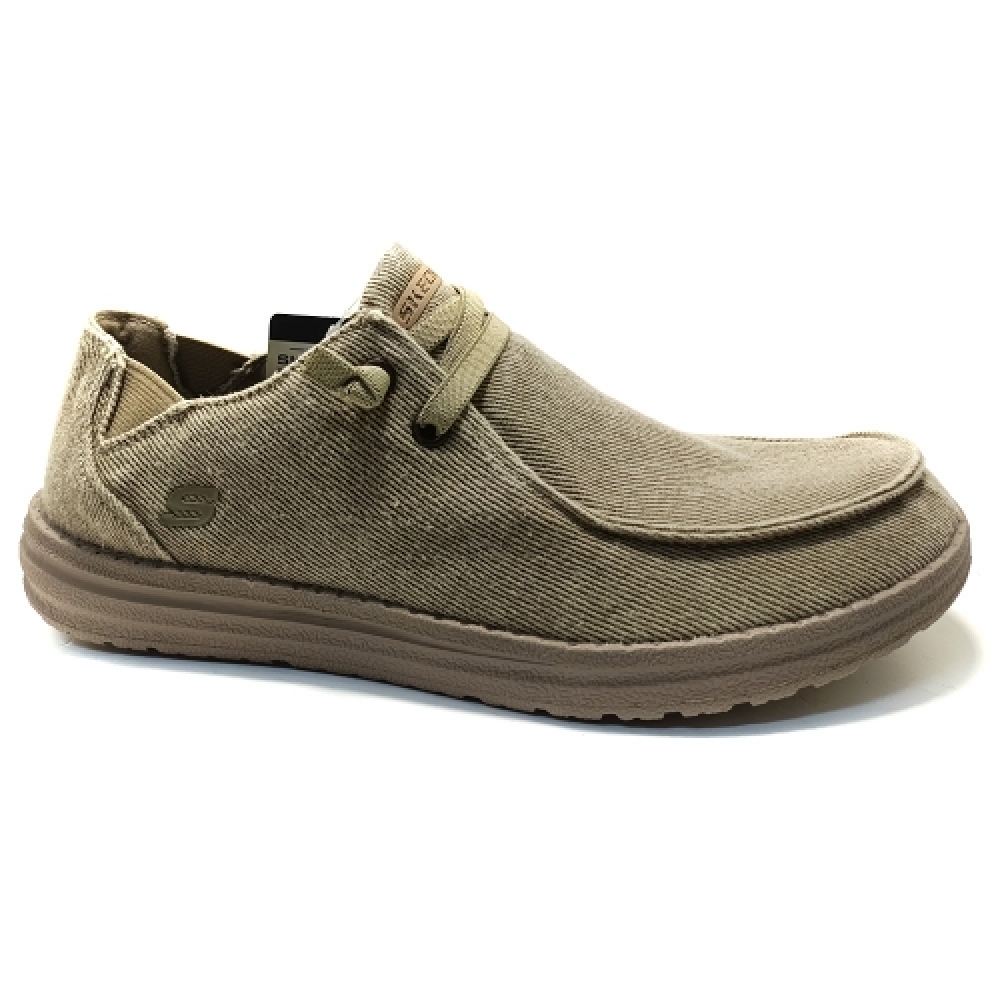 Responde a la llamada del estilo playero con el look relajado y la comodidad del Skechers Melson - Volgo. Mocasín casual playero slip on con puntera de mocasín y con cordones elásticos, parte superior de suave lona y plantilla Air-Cooled Memory Foam.
