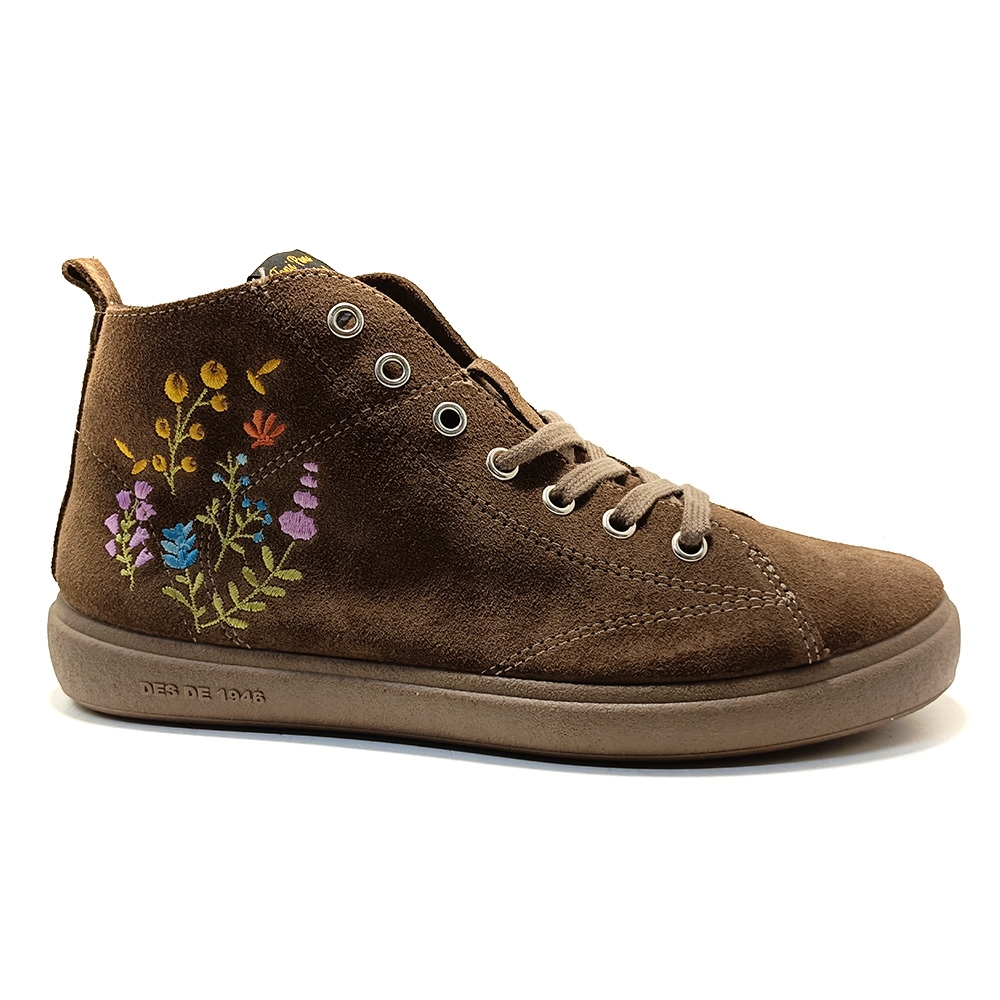 ORDIS. Este botín para mujer forma parte de la cápsula Costa Brava. Está elaborado en serraje con detalles de flores bordadas en el lateral. Tiene el diseño del clásico zapato de invierno abotinado con cordones. La suela es plana, tiene 2 cm de grosor y está hecha de goma antideslizante. Tiene una cómoda cremallera lateral como cierre. La plantilla interior está forrada en tejido y está acolchada para mayor comodidad. Cuenta con un tirador trasero para facilitar su colocación.