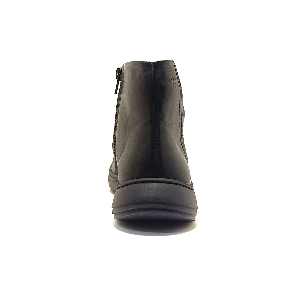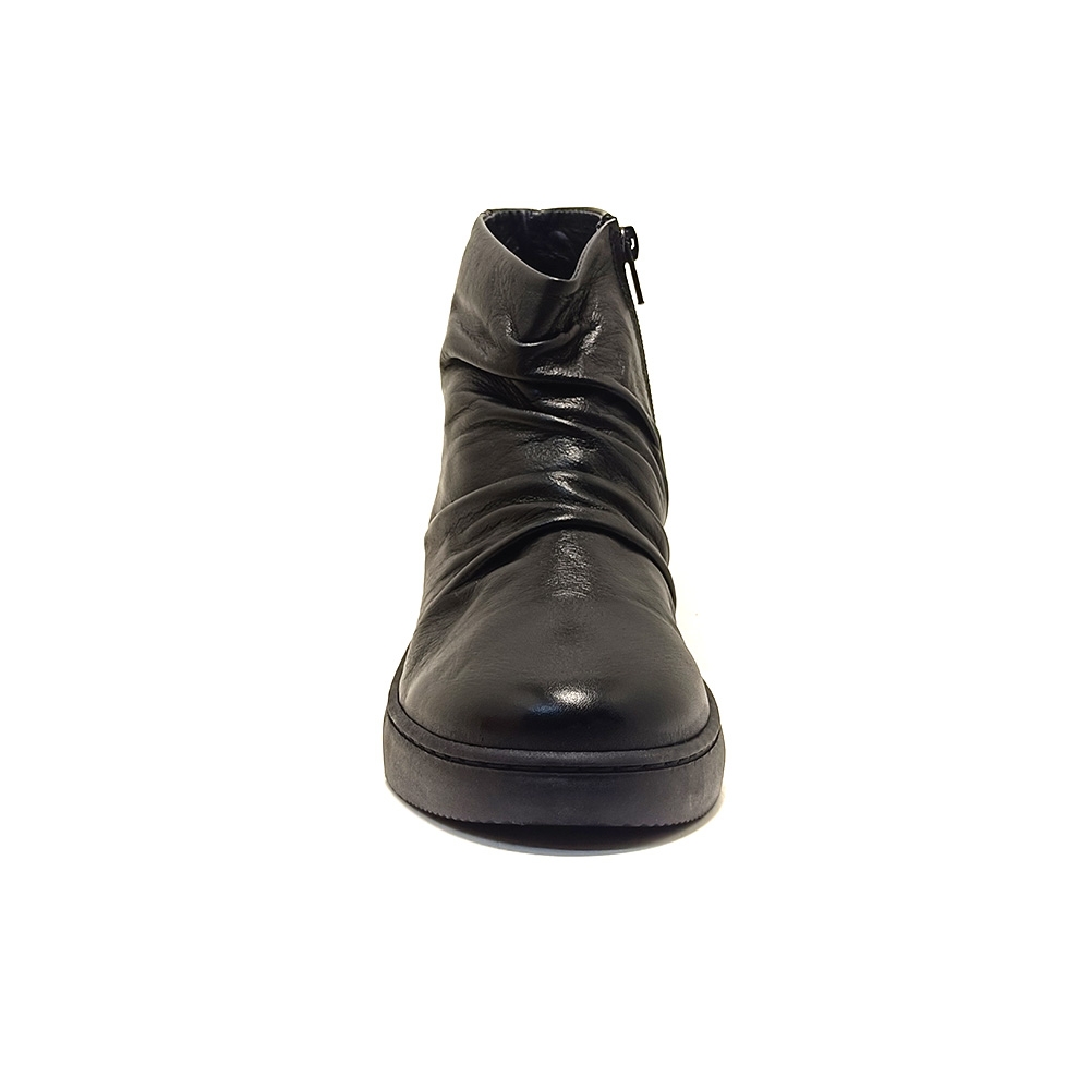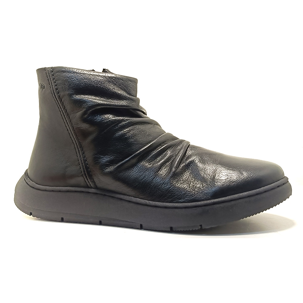 PRETORIA. Este botín para mujer se elabora en piel en tonos lisos. Cuenta con una cremallera lateral para facilitar su colocación. La suela contrastada de 3 cm es de goma antideslizante. La piel del empeine tiene un efecto arrugado. El forro interior y la planta son de tejido sintético.