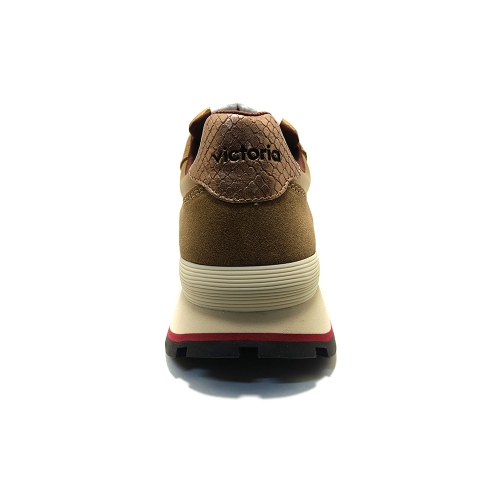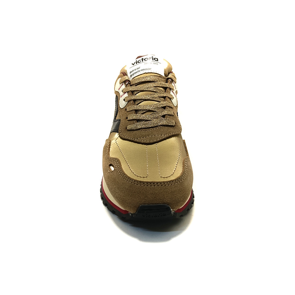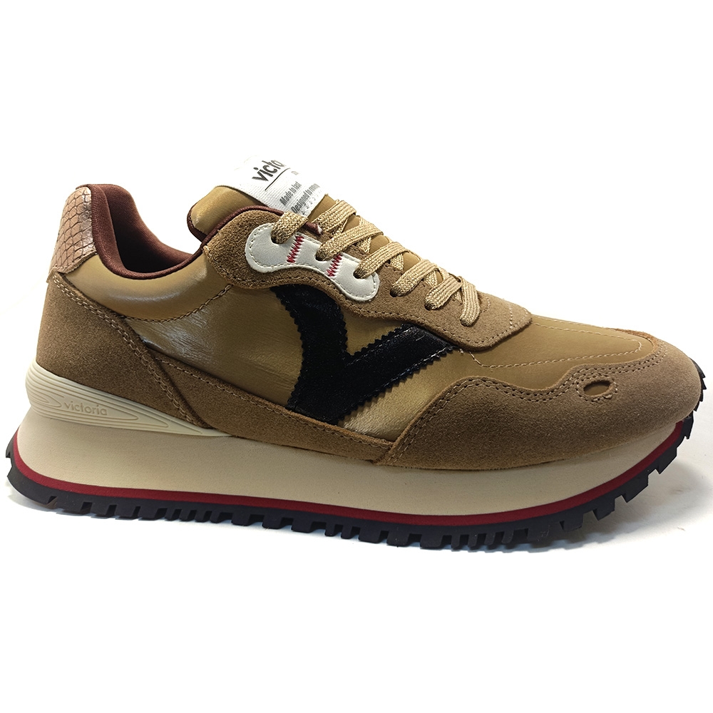 Sneakers para mujer confeccionadas en nylon con un acabado metalizado en combinación con piezas de serraje y detalles sintéticos. V del lateral y pieza trasera con el logotipo de la marca en efecto brillo metalizado. Cierre mediante cordones con fibras metalizadas. Su ligereza y carácter deportivo se ven realzados por detalles como la suela ancha, el estabilizador del talón y el patín negro en relieve antideslizante, que favorece un mayor agarre.