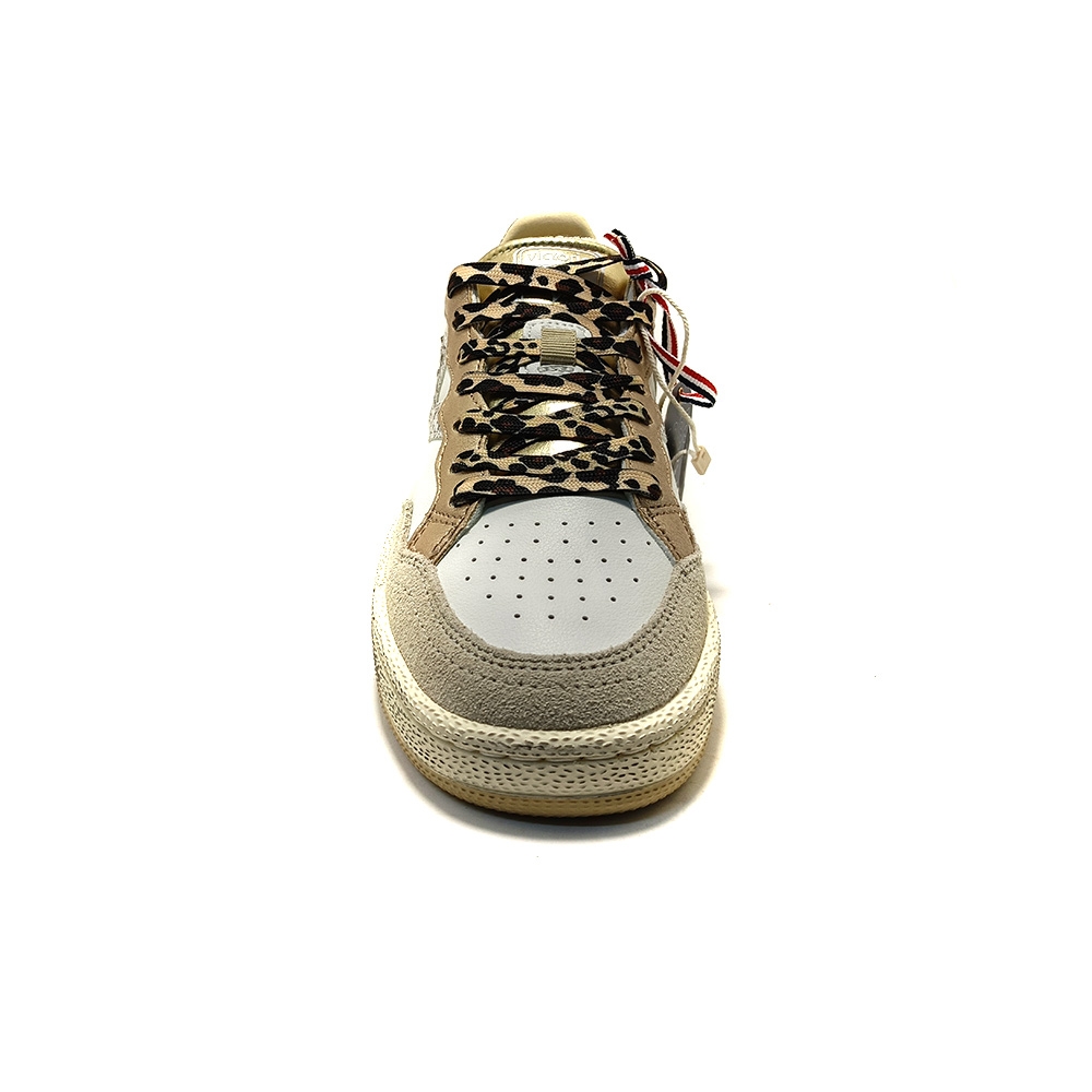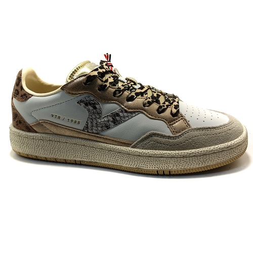 Zapatillas deportivas para mujer confeccionadas en piel con piezas superpuestas de microfibra metalizada. V retro en el lateral en "snake PU", y talonera en serraje con estampado animal print y etiqueta de goma. Cierre mediante cordones bicolor. Forro de microfibra transpirable y suela bicolor de caucho 100% natural con acabado envejecido y textura rugosa. Además, incluyen plantilla ergonómica que se adapta a la forma del pie y regala la sensación de comodidad.